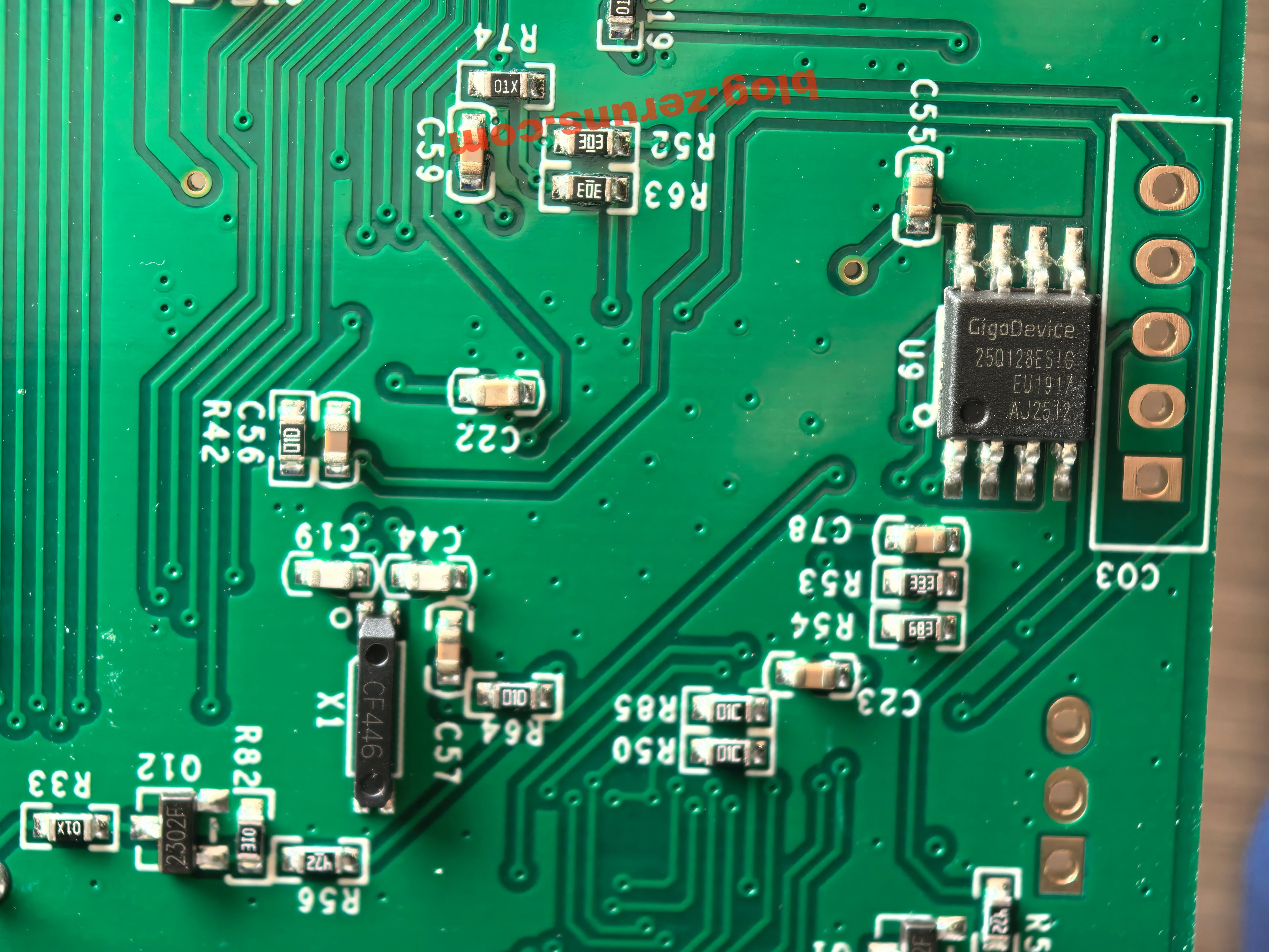 Mặt sau MCU chính có một chip model GD25Q128ESIG, đây là chip flash SPI 128M-bit (16MB) do GigaDevice sản xuất, sử dụng vỏ SOP8, hỗ trợ giao diện SPI tiêu chuẩn/kép/tứ, điện áp hoạt động 2.7~3.6V. Tôi đoán có lẽ dùng để lưu trữ các tài nguyên liên quan đến thư viện đồ họa.