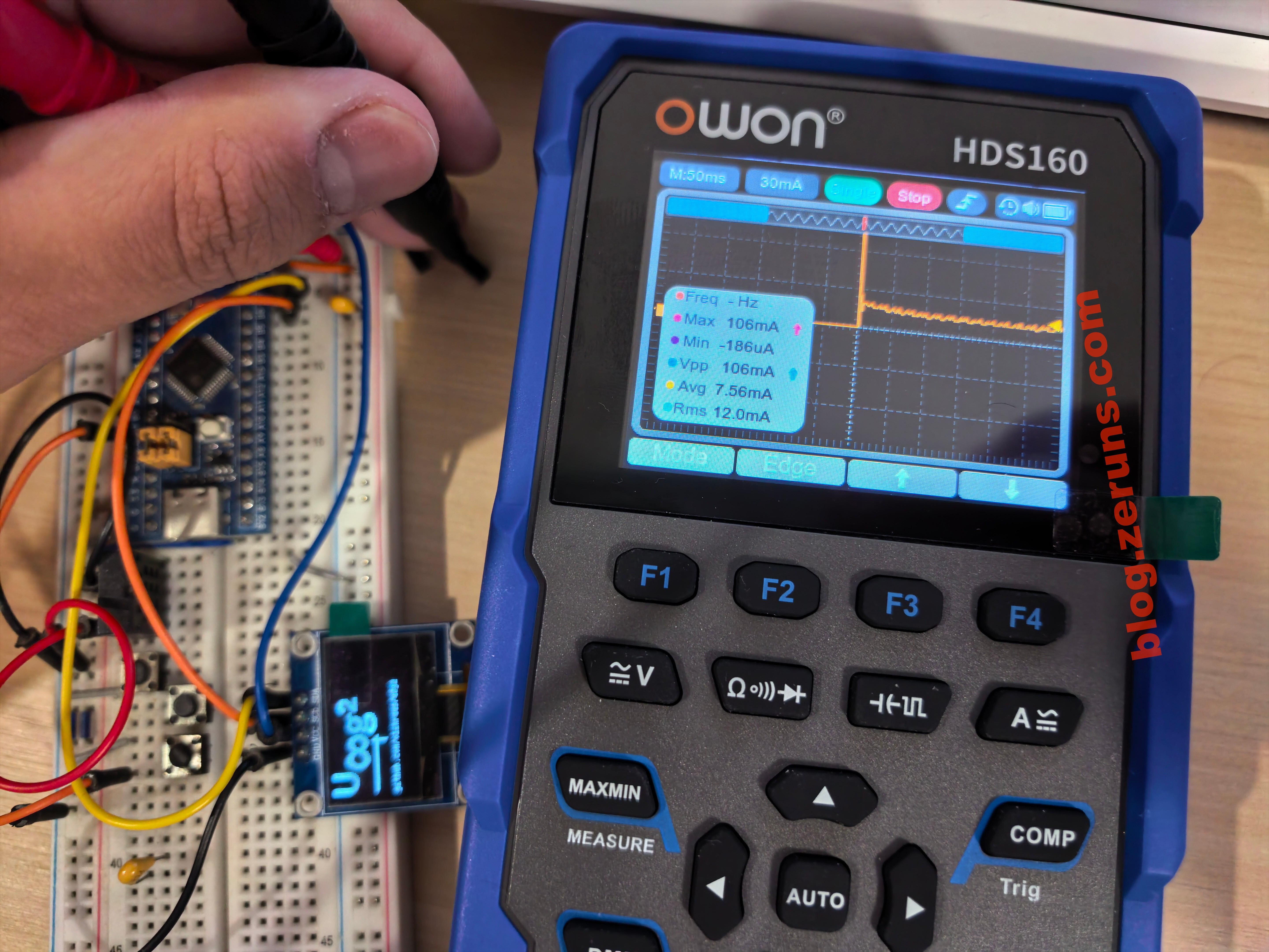 Cắm que đo vào khe đo dòng điện, thiết bị tự động chuyển sang chế độ dòng. Trong chế độ dao động ký, chuyển sang kích hoạt đơn lần (single trigger), đo dạng sóng dòng điện lúc cấp nguồn cho vi điều khiển STM32F103 kết hợp màn hình OLED, dòng cực đại đạt 106mA.