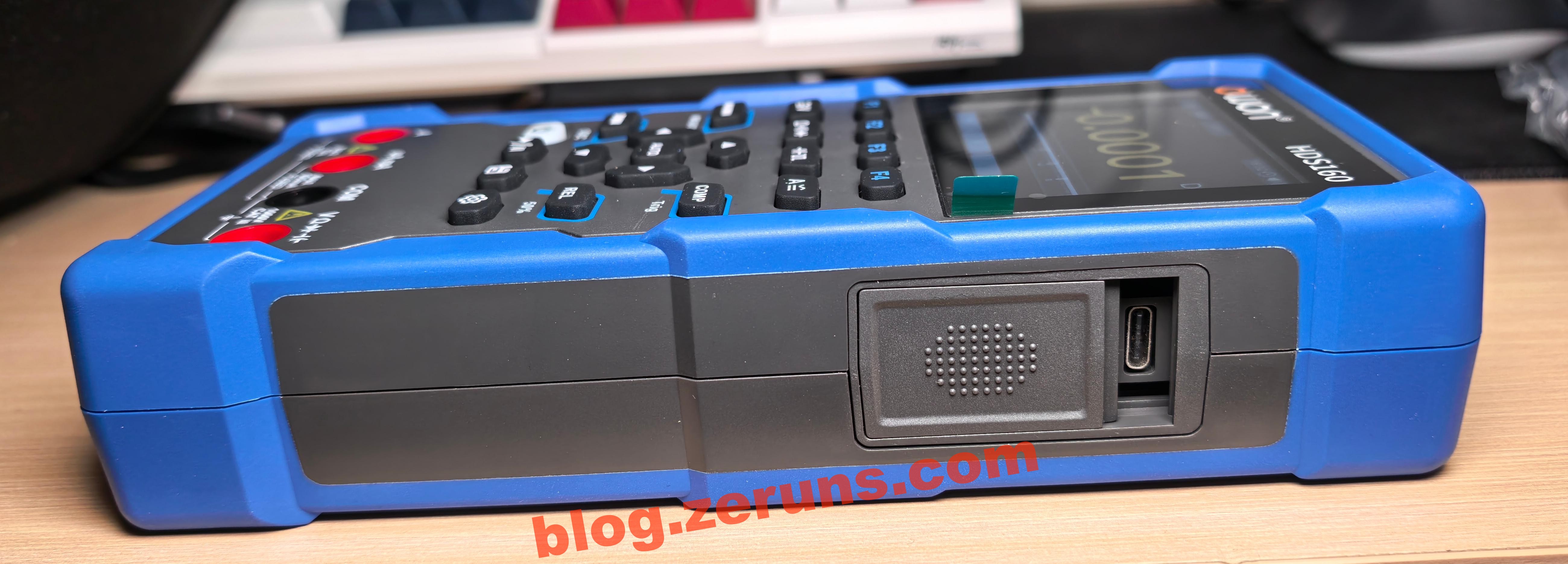 Mặt bên đồng hồ vạn năng có một cổng Type-C dùng để sạc. Khi cắm vào máy tính, thiết bị hiện như một USB ảo, cho phép sao chép trực tiếp ảnh chụp màn hình từ chế độ dao động ký. Cổng C này có vẻ hơi lệch (phần tháo máy phía sau sẽ cho thấy do hàn dán sai vị trí). Có một thanh trượt gần cổng C, khi gạt xuống để sạc sẽ che chắn các khe cắm que đo, ngăn việc sử dụng đồng thời khi đang sạc.