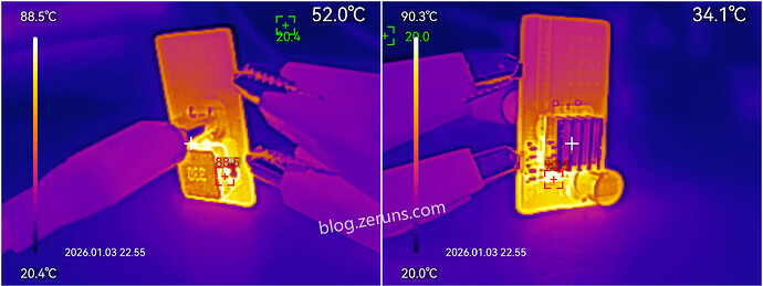 最大功率工作热成像图,芯片最高温度90.3℃左右(贴了个小散热片后的效果)