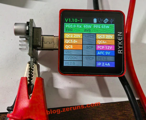 快充协议测试,实测支持的协议有:PD3.0 FIX 65W PPS 63W、QC2 20V、QC3 20V、QC3.0+、QC4+、QC5、FCP 12V、AFC 9V、iP 2.4A。