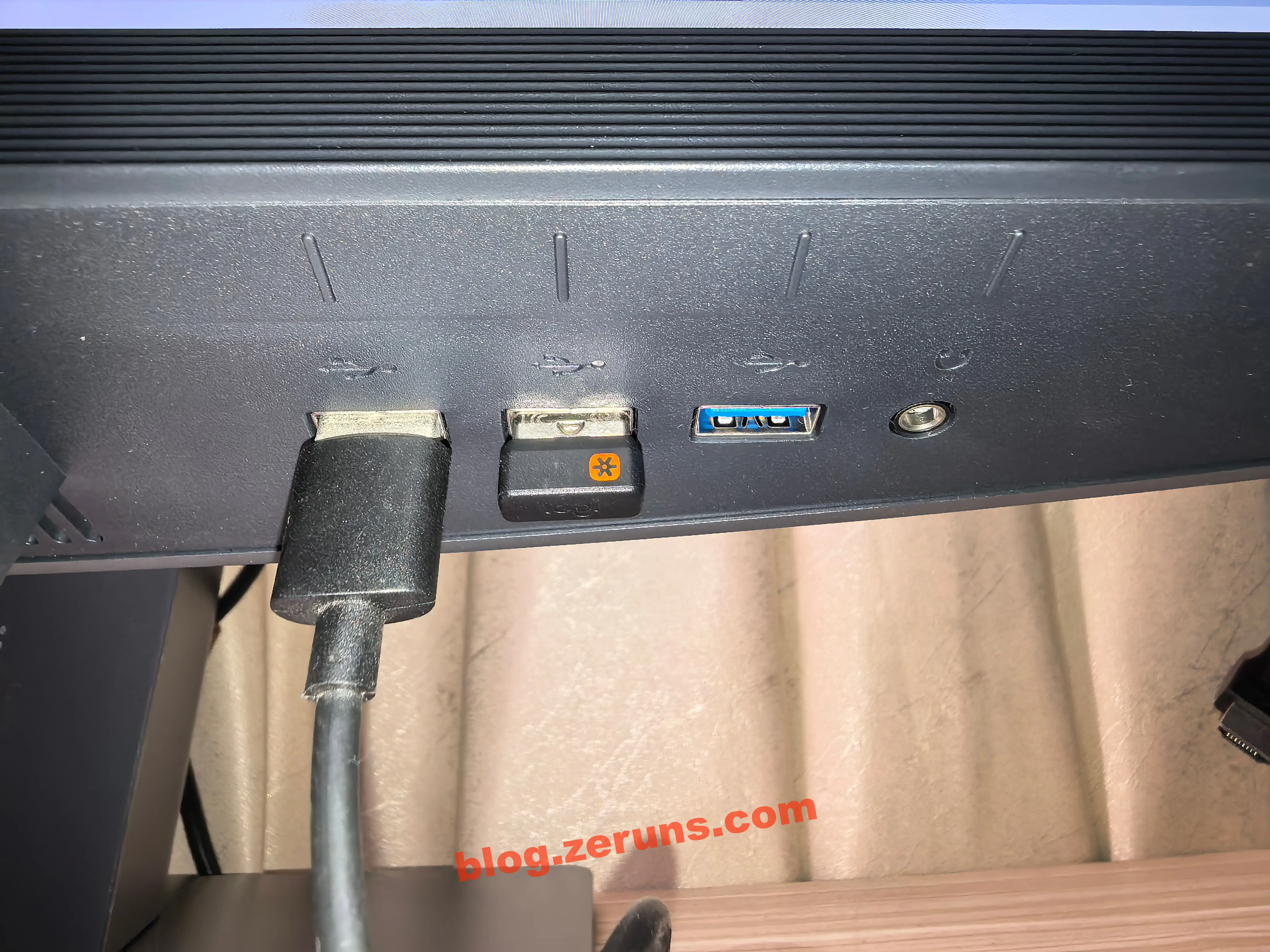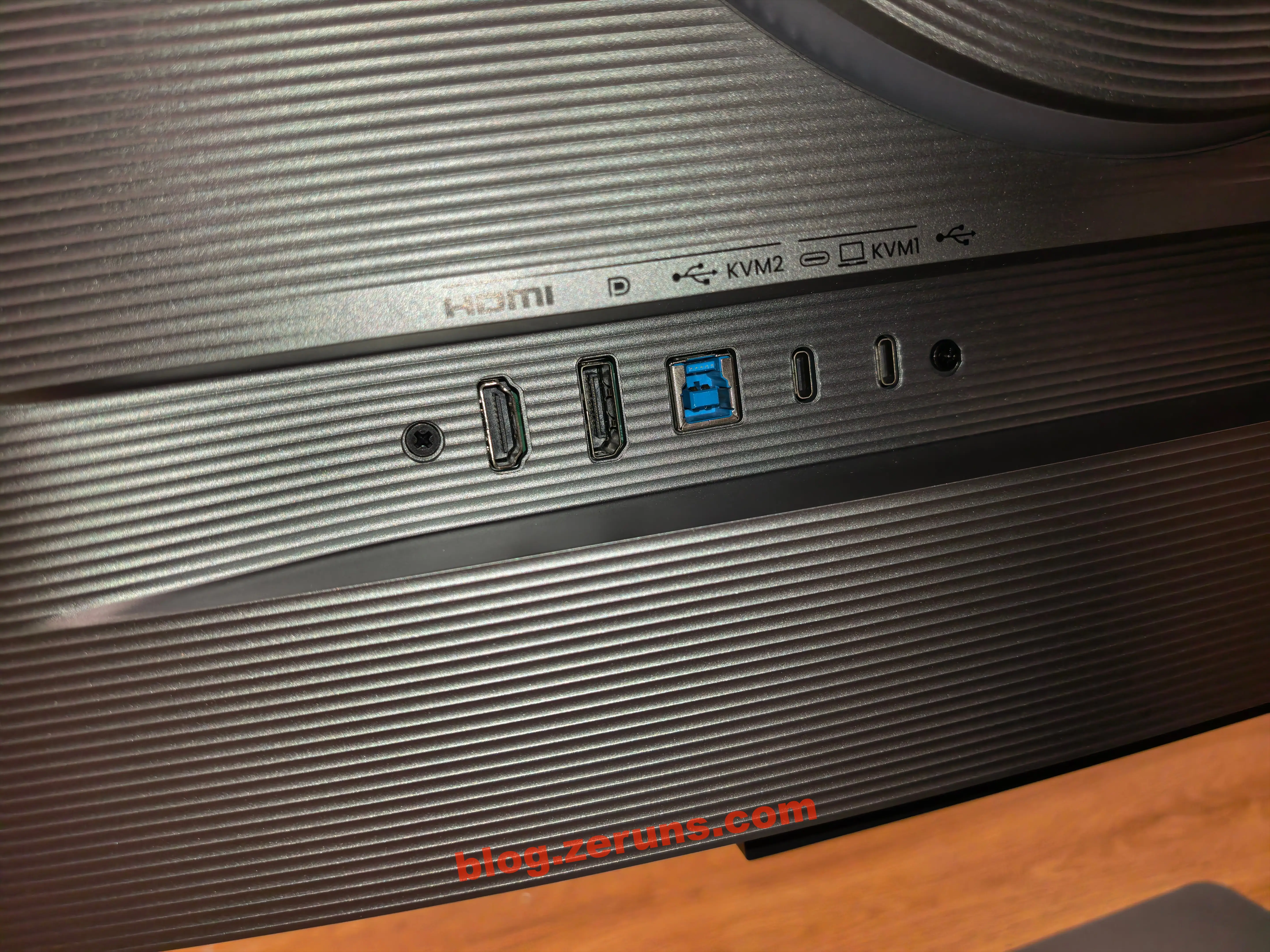 画面右下にはUSB-Aポート3つと3.5mmヘッドフォンジャックがあります。すべてのAポートは5Gbpsで動作(背面のType-BまたはType-C入力から拡張され、入力ソースと連動してKVM機能を有効化—ここにキーボードとマウスを接続すれば、1組で2台のコンピュータを制御できます)。