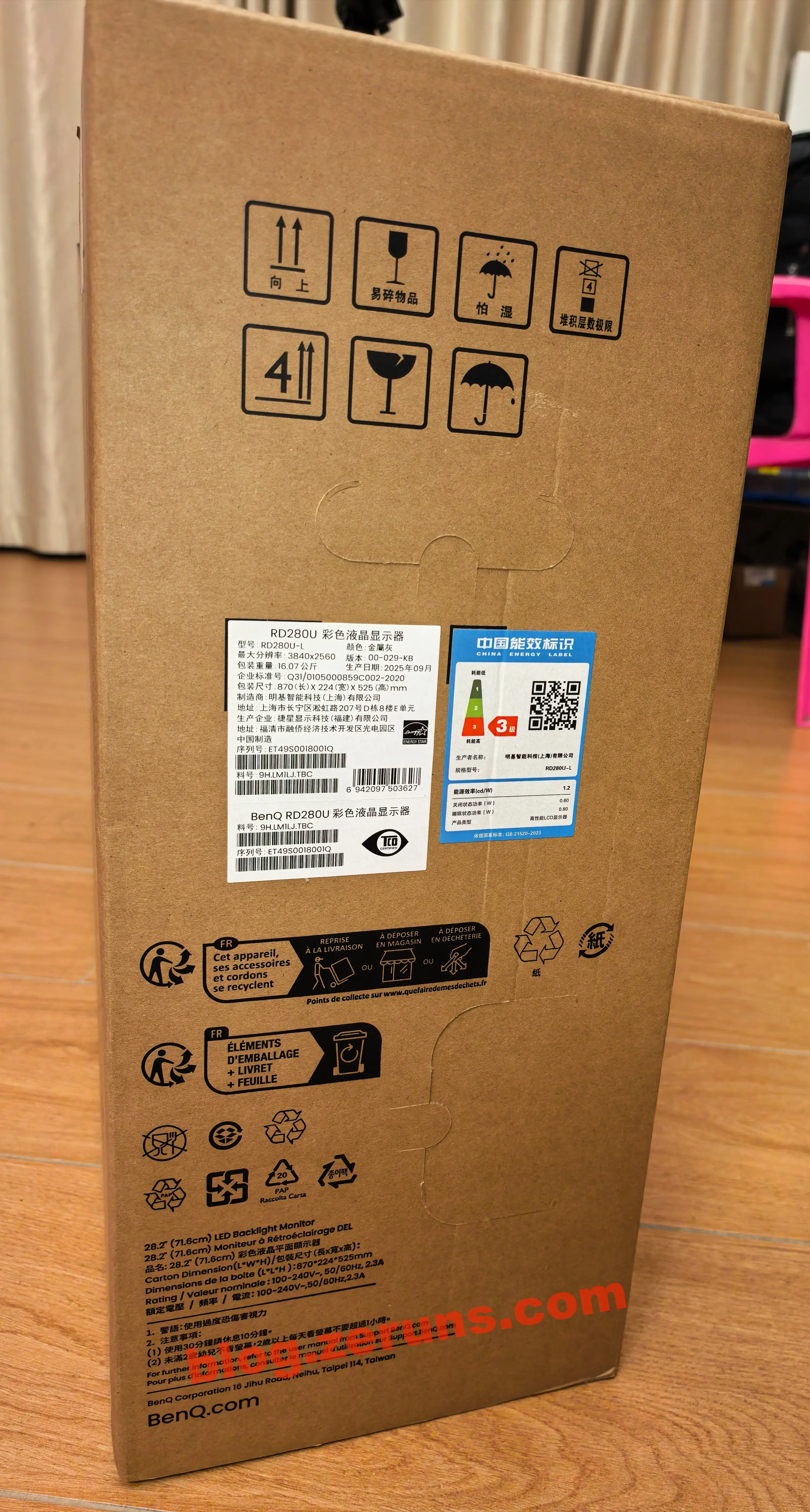 箱の側面には以下の主要情報がラベルで記載されています: