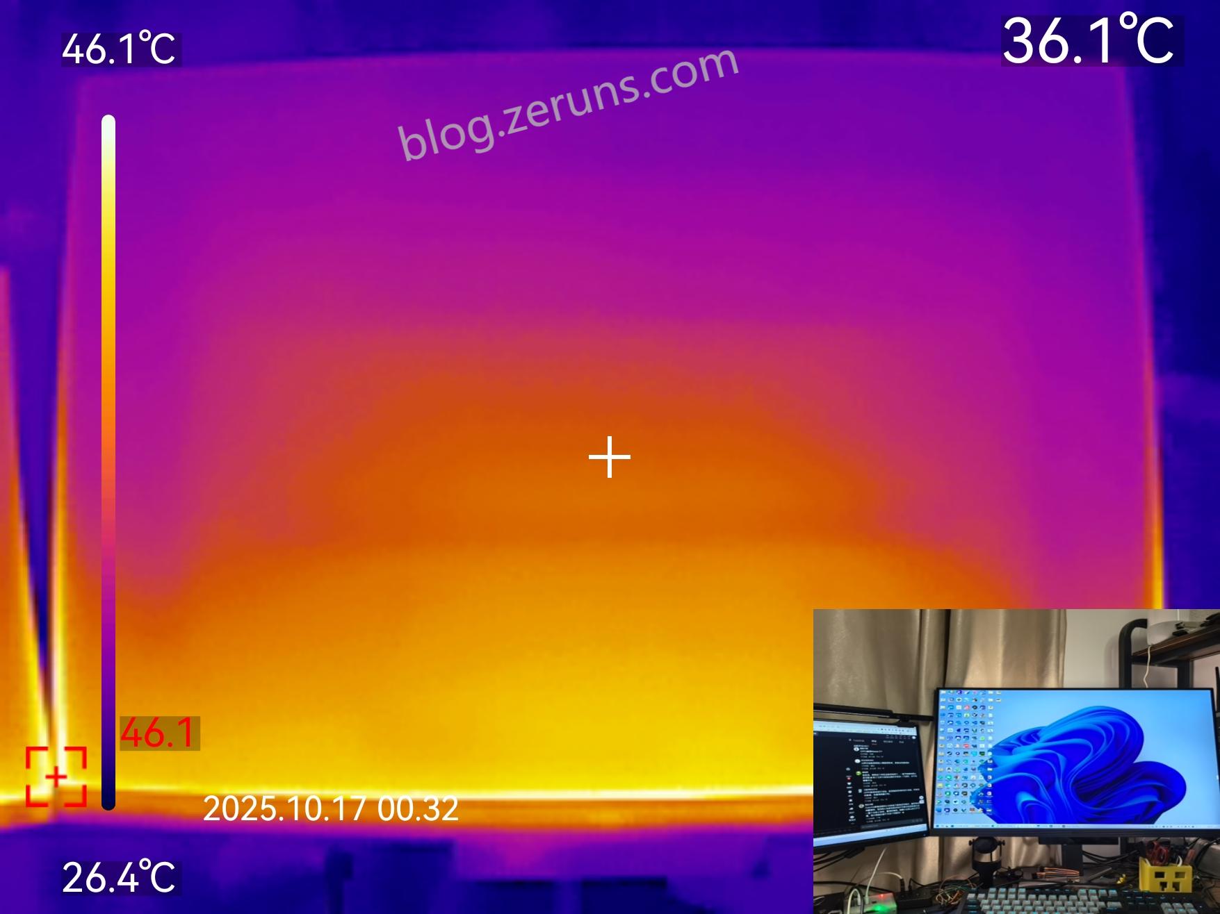 以下は画面の熱分布のサーモグラフィーです。熱は主に画面下部に集中しており、バックライトがおそらくこの位置にあります。最大温度は46.1°C(室温は約26°C)です。
