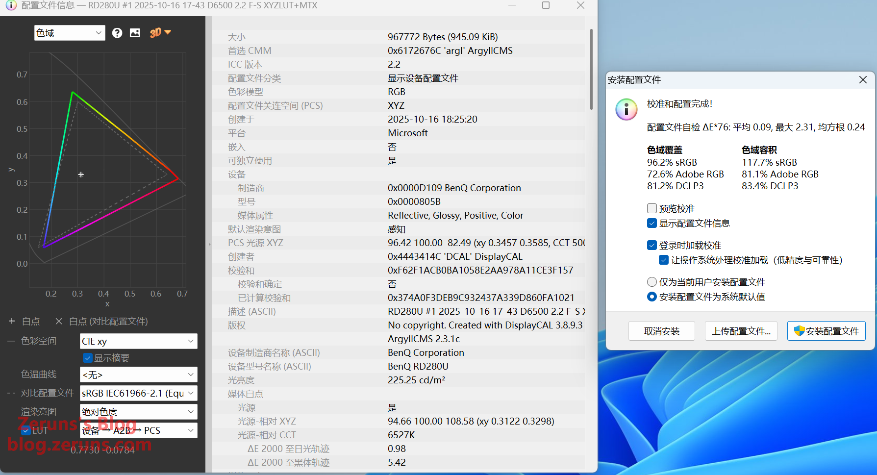 Spyder5キャリブレーターを使用して実測した色域と精度データ:sRGBカバー率96.2%、体積117.7%、平均色差(平均ΔE*00)は2.23 — 良好、最大偏差(最大ΔE*00)は6.26とやや高めです。最大偏差は青領域に見られ、ハードウェアのブルーライトフィルタリングに関連している可能性があります。