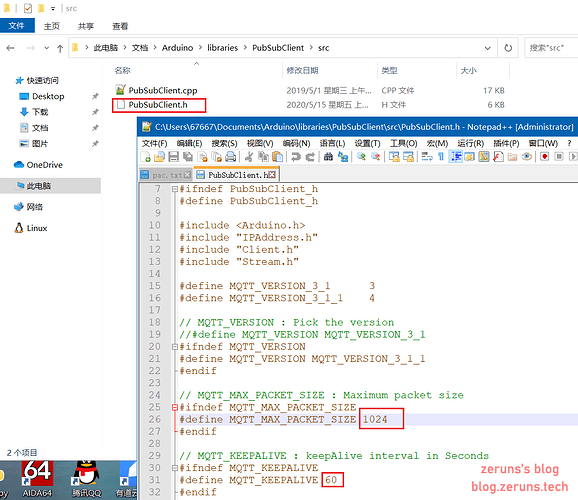 找到PubSubClient.h文件,将 #define MQTT_MAX_PACKET_SIZE后的数字改为1024,将 #define MQTT_KEEPALIVE后的数字改为60