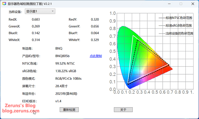 屏幕EDID信息,屏幕尺寸28.4英寸,屏幕型号是BNQ805b,生产日期2023年第46周,sRGB色域138.22%。