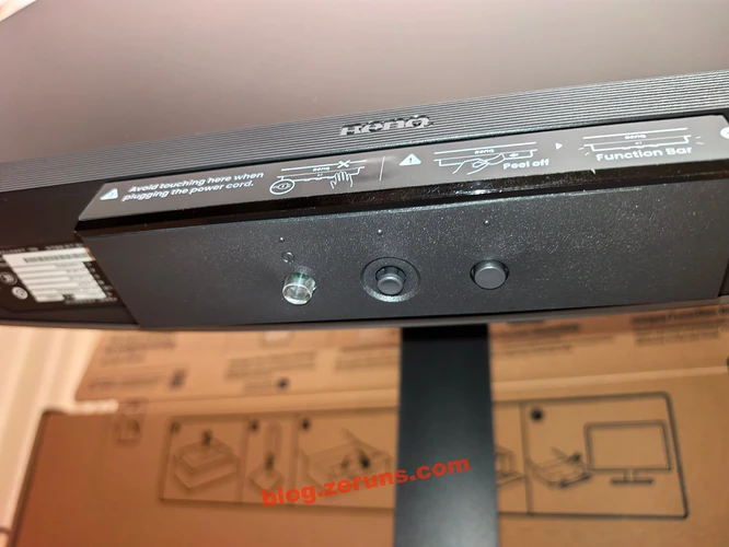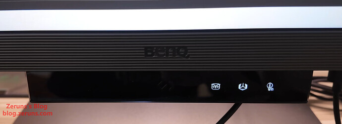 显示器底部的“小下巴”上有红外距离传感器和环境亮度传感器,“小下巴”中间是一个触摸按键,可以快速切换屏幕色彩模式。