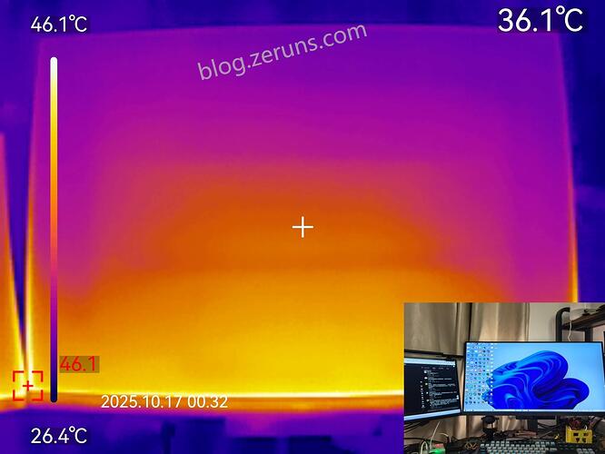屏幕发热情况热成像图如下图,发热主要集中在屏幕底部,屏幕背光灯应该在底部,最高温度46.1℃(室温26度左右)。