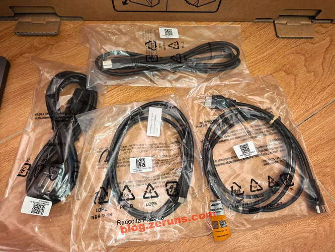 配套数据线有 品字头电源线、HDMI、USB-A to B 线、双公头Type-C线。