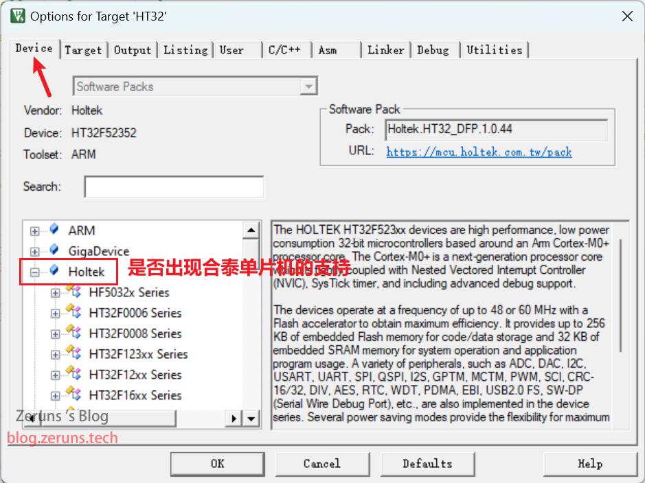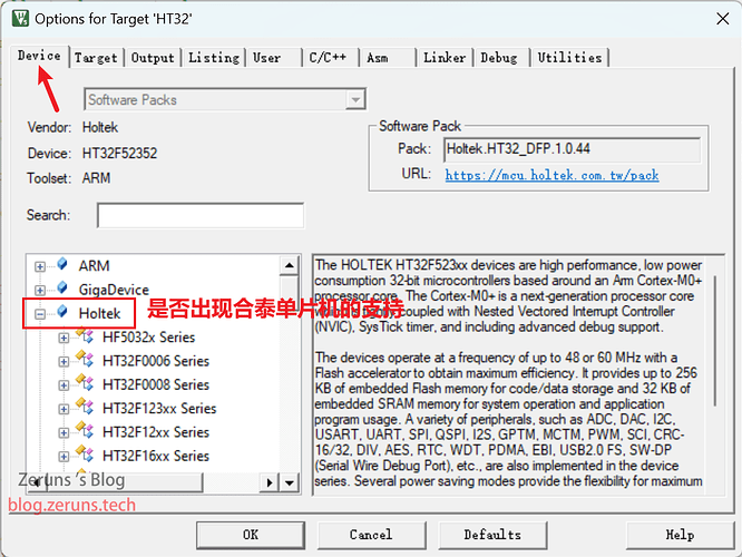 首先需要安装Keil MDK-ARM,这个就不详讲了,自己百度,或者看合泰的教程,合泰有提供Keil的激活码,可以用于 Holtek 的 Arm® Cortex-M0+ 微控制器系列产品,教程链接:https://url.zeruns.com/kwuFg