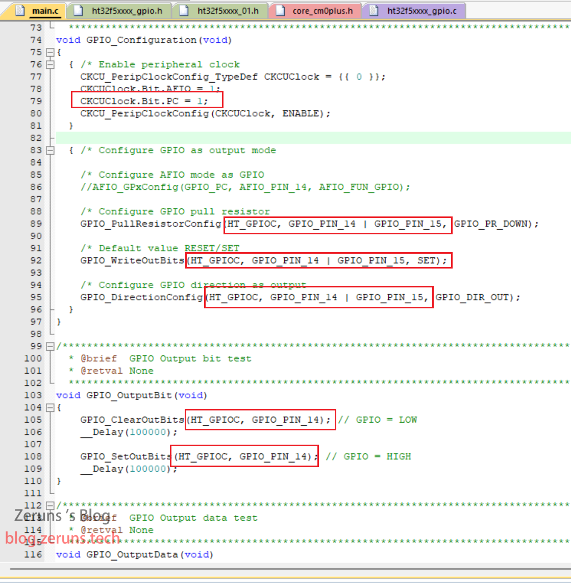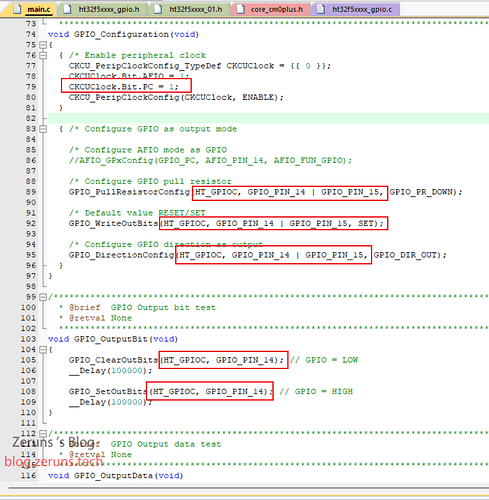 修改一下官方固件库里的GPIO/Output例程,修改如下图红框所示位置的内容后编译并下载即可点亮LED。